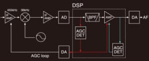 The digital signal processing is incorporated into the AGC function loop. The results of signal processing provide feedback to the AGC function. The AGC function works on the intended signal and produces a constant audio output. The AGC time constants are flexibly adjustable from slow, middle, fast (or AGC off) for each operating mode.